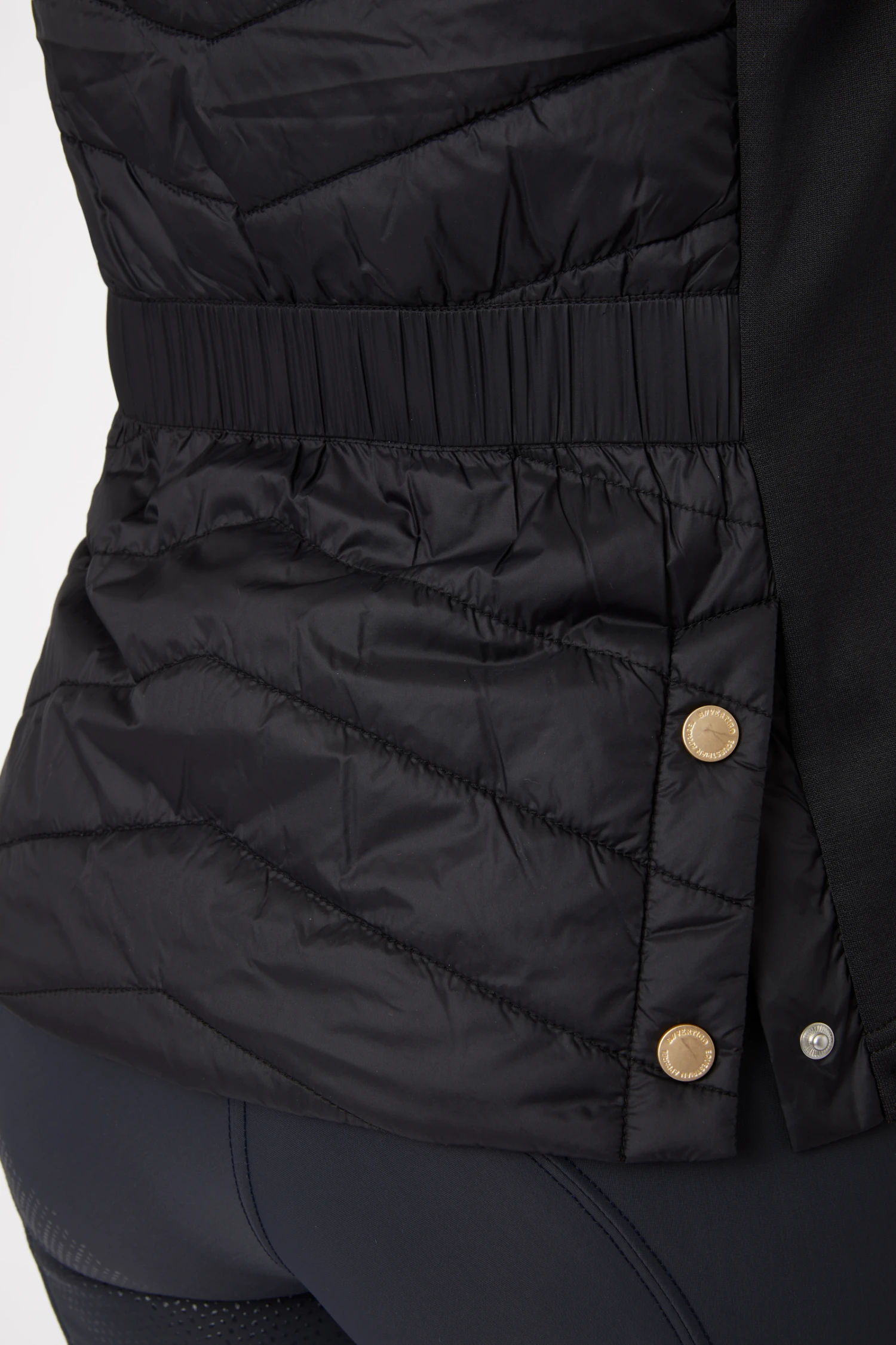 Diese elegante, leicht wattierte Weste zaubert dank des dehnbaren Taillengürtels auf der Rückseite eine schöne, feminine Silhouette. Mit den eleganten goldenen Details, wie Knöpfen, Zwei-Wege-Reißverschluss und Logo im Nacken ist diese Weste ein echtes Must-Have für den stilvollen Stall-Look. In den Reißverschlusstaschen sind kleine Gegenstände sicher verstaut. Die Knöpfe am Rücken öffnen Reitschlitze für mehr Bewegungsfreiheit im Sattel.