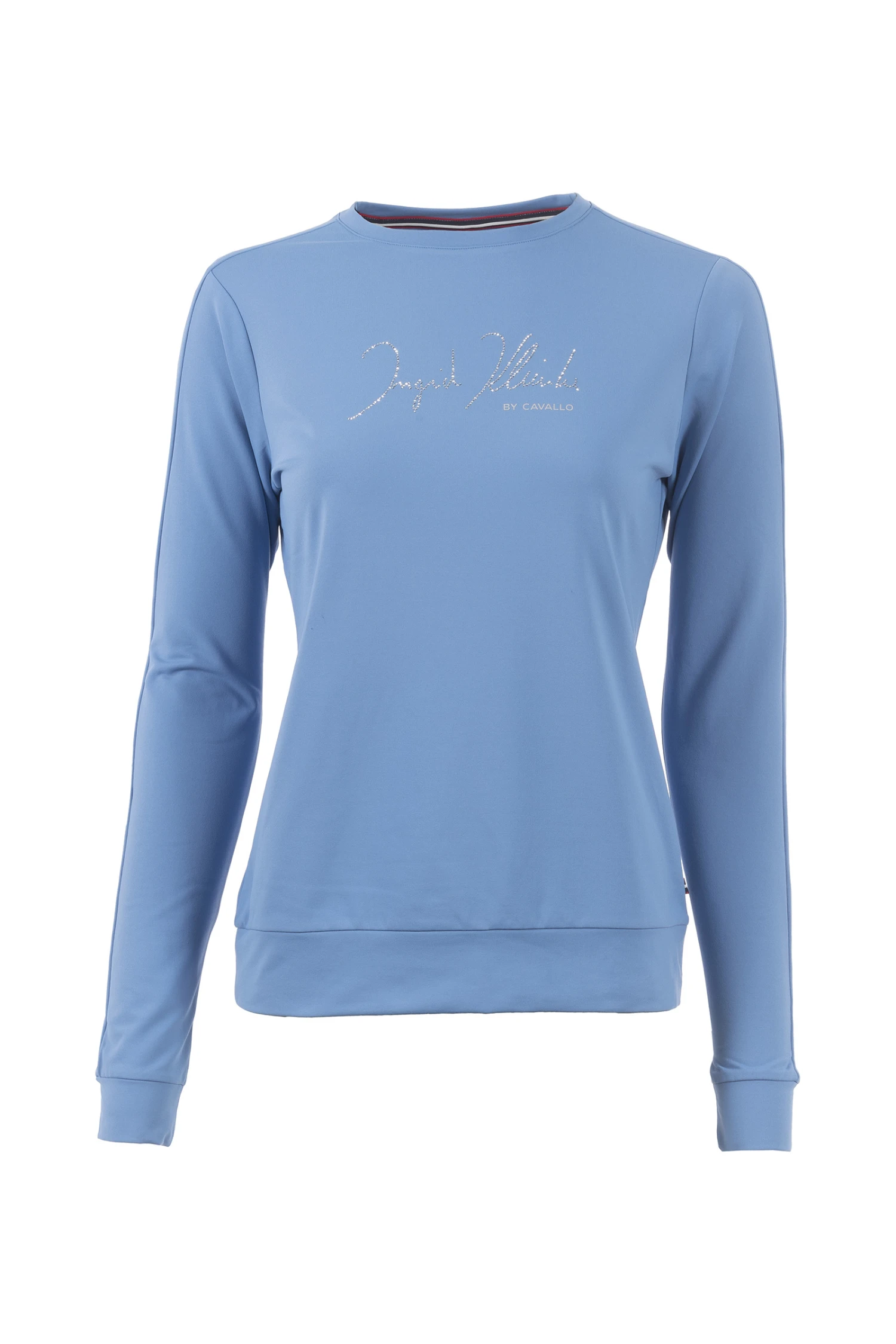 Sportlich eleganter Rundhals-Pullover aus bi-elastischer Funktionsware. Innenseite leicht angeraut für ein angenehmes Tragegefühl. Elegant geschwungener Ingrid Klimke Schriftzug aus Kristallsteinen mittig auf der Front. Kleines Cavallo Steigbügel-Artwork am linken Ärmelsaum in Silber.