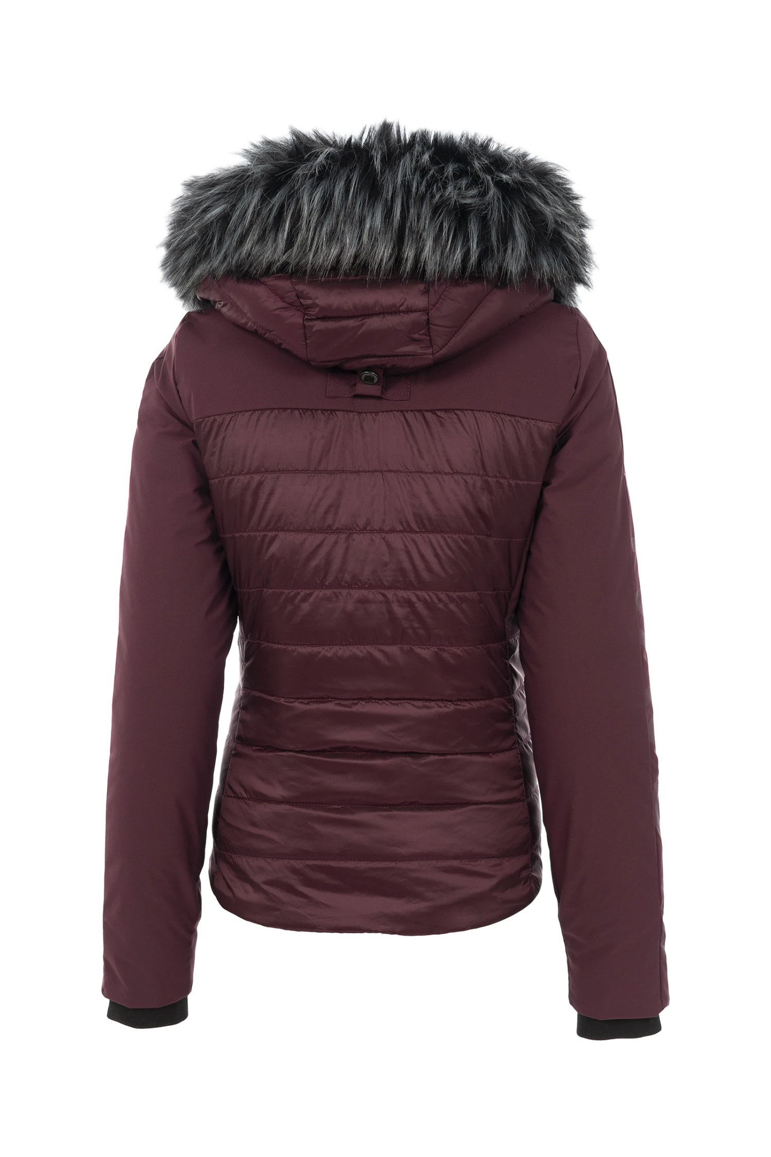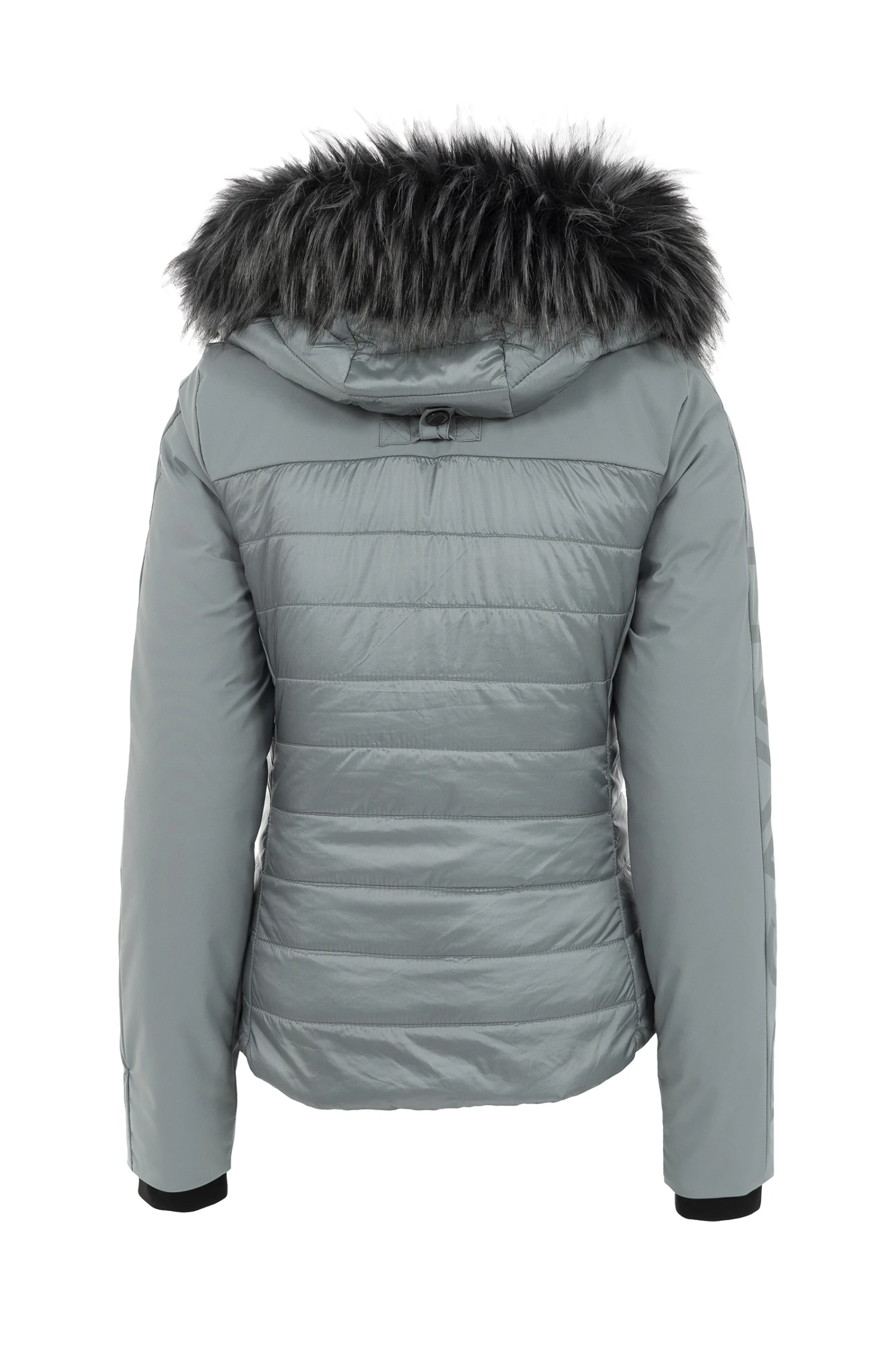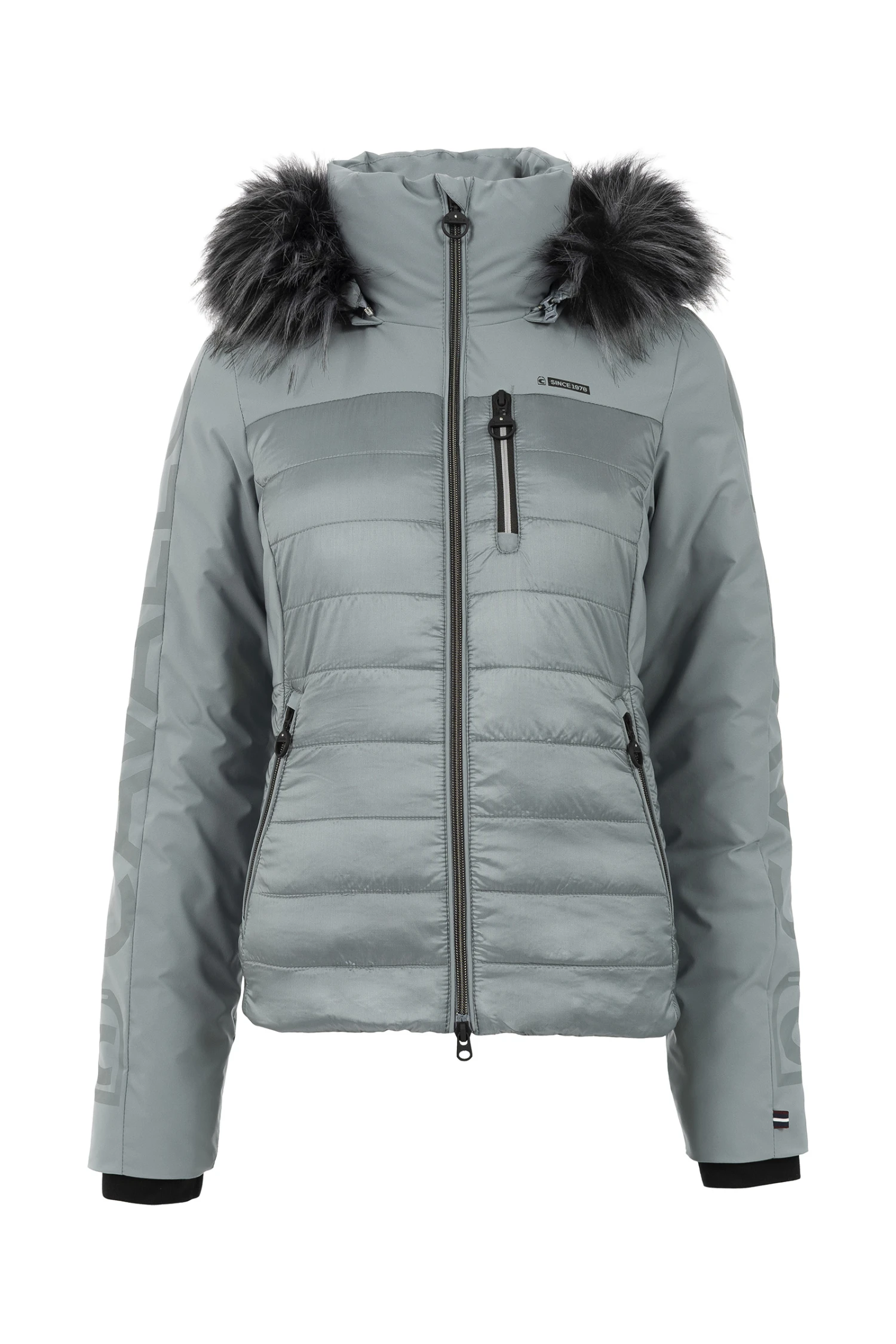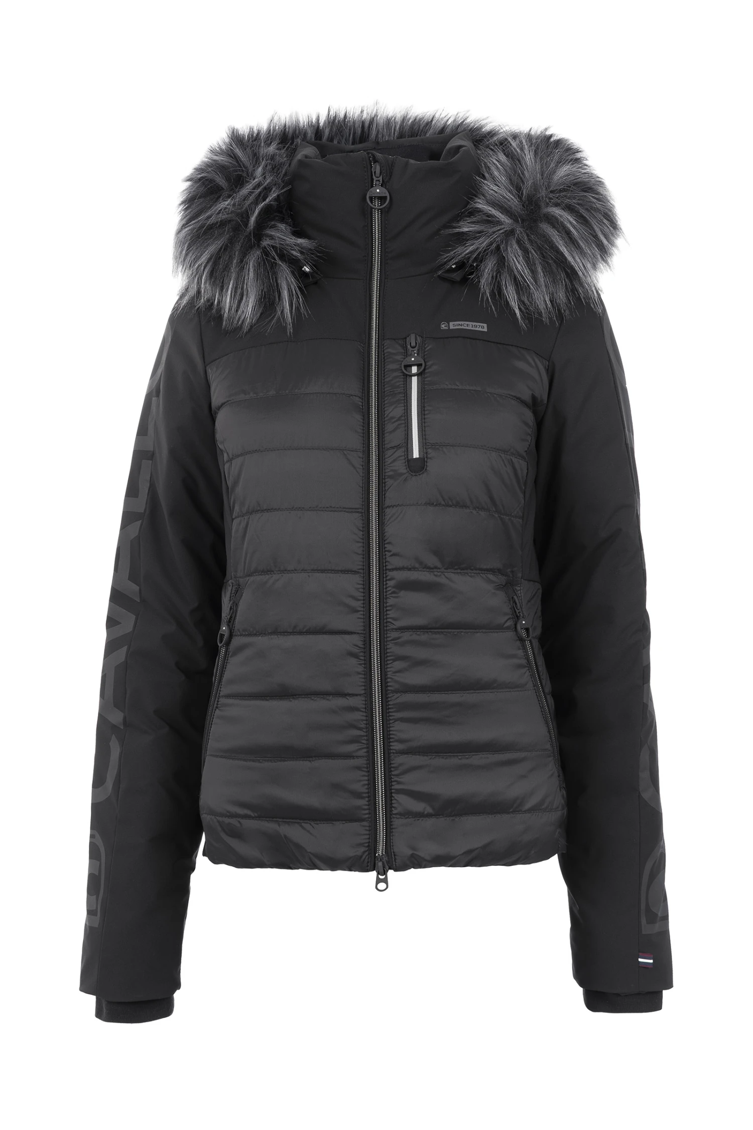 Mit abnehmbarer Kapuze mit Kunstfellkranz. Steppdessin außen sichtbar an Vorder-und Rückenteil sowie dem unterem Seitenteil. Steppung innen überall sichtbar mit großem Cavallo Print im Rücken. Schulter, Ärmel und oberes Seitenteil außen glatt. Zwei Reißverschlusstaschen mit Cavallo Schmuckanhänger mit Kristall. Brusttasche links mit reflektierendem Reißverschluss. 2-Wege-Reißverschluss in der vorderen Mitte. Frontreißverschluss und Brusttaschen Reißverschluss ebenfalls mit Cavallo Schmuckanhänger mit Kristall. Innentasche mit Reißverschluss. Großes, tonales Cavallo Artwork entlang der Ärmel. Ärmelabschluss mit innen liegendem Strickbund in Schwarz.