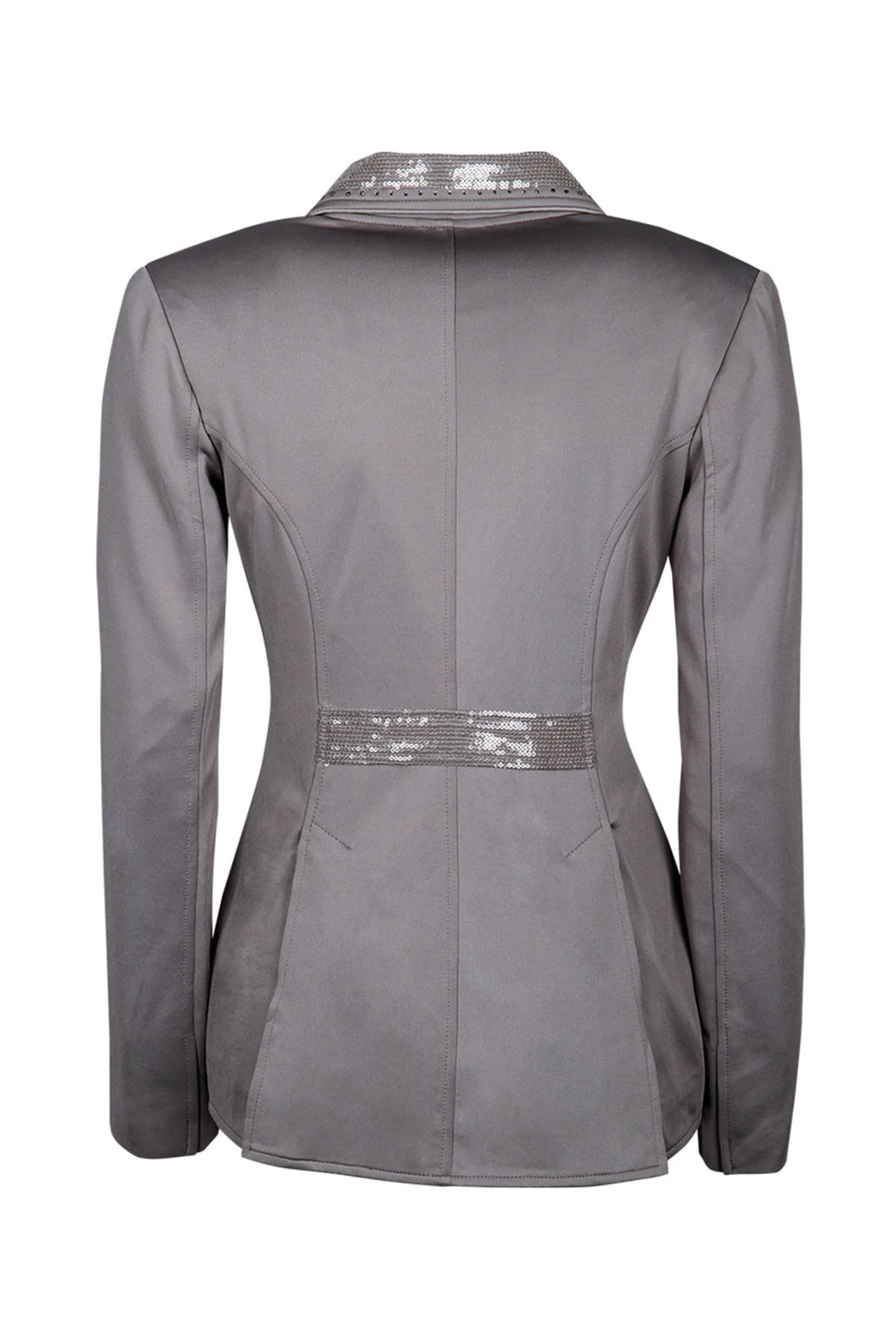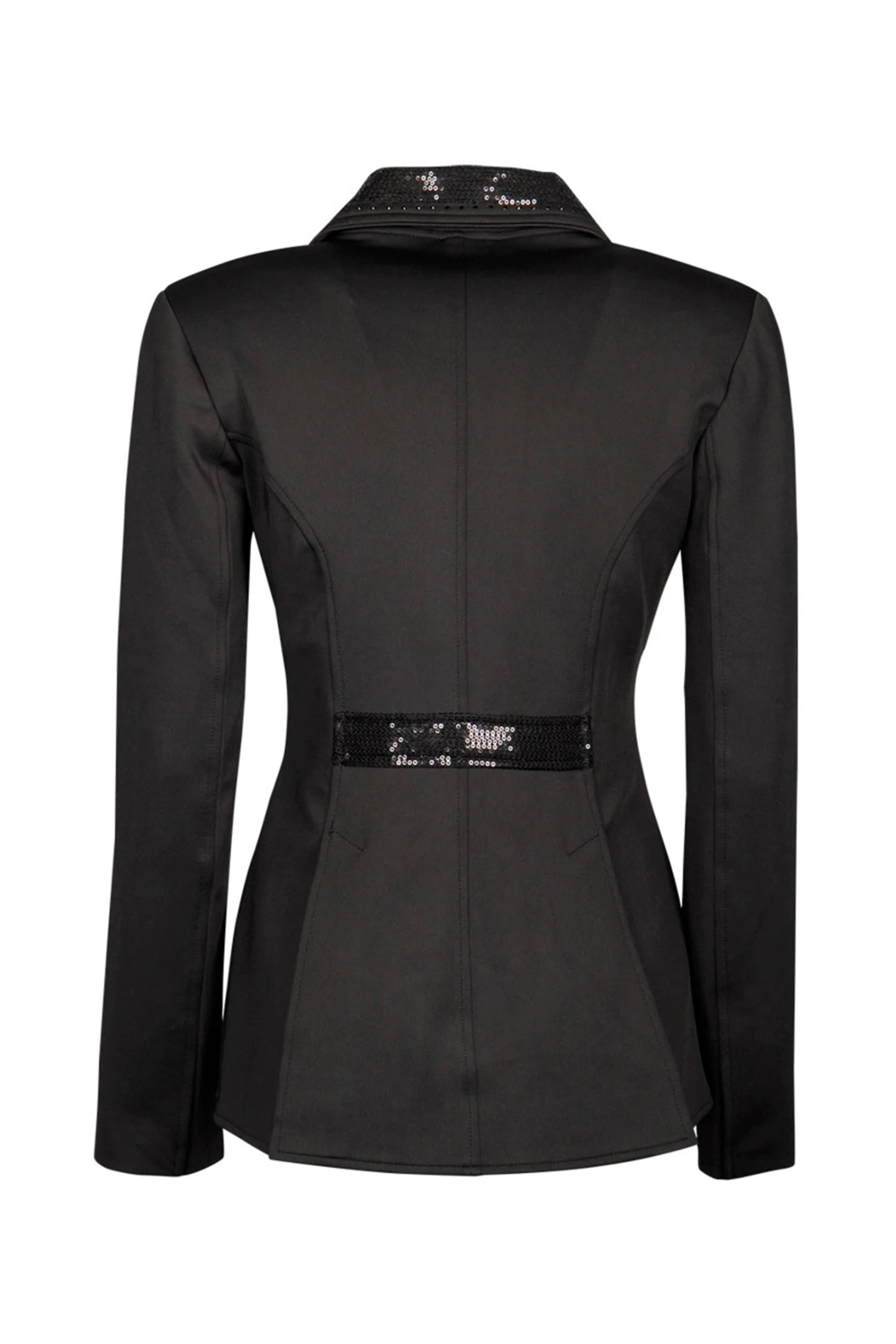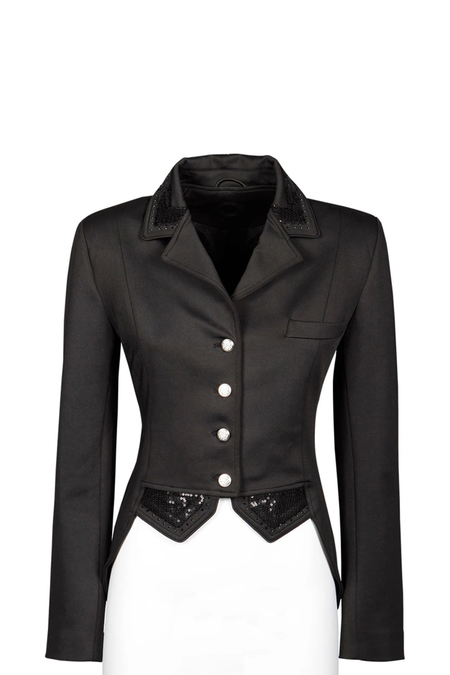 Edles Turnierjackett aus hochwertigem Stretch-Material. Die Jacke ist mit einem Kristallknopf und darunter liegendem Reißverschluss für perfekte Passform ausgestattet, am Kragen und den Gehschlitzen sind farblich passende Pailletten/Kristalle und eine Paspel angebracht. Mit Zierknöpfen.