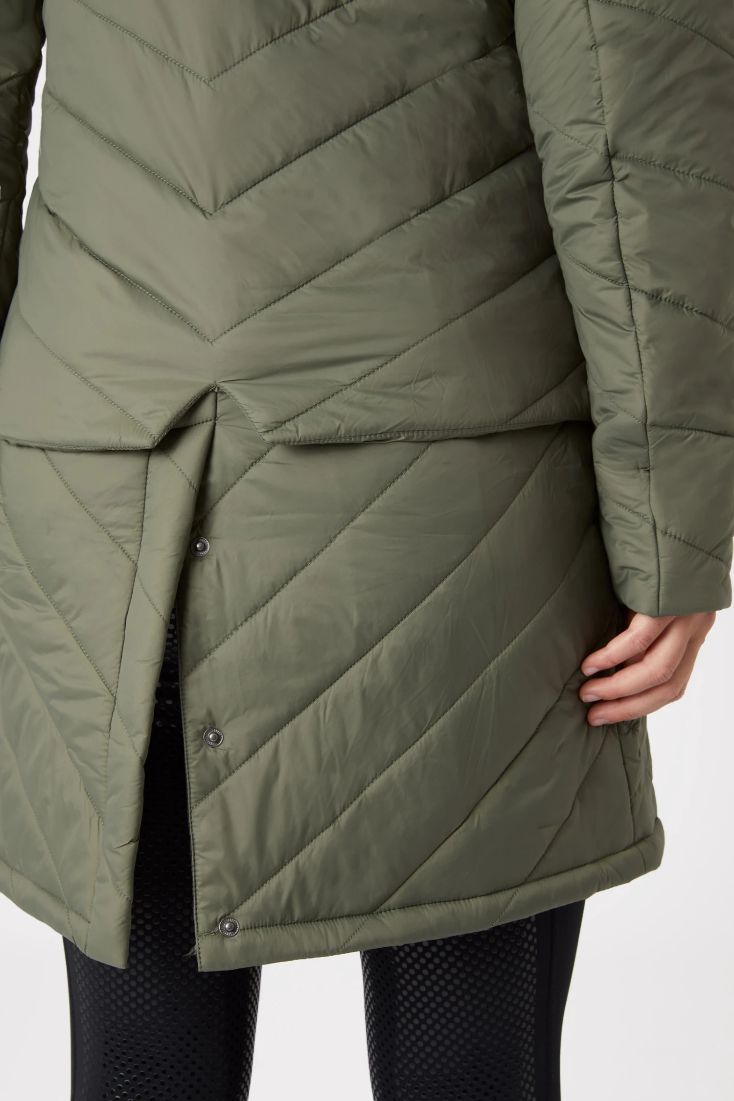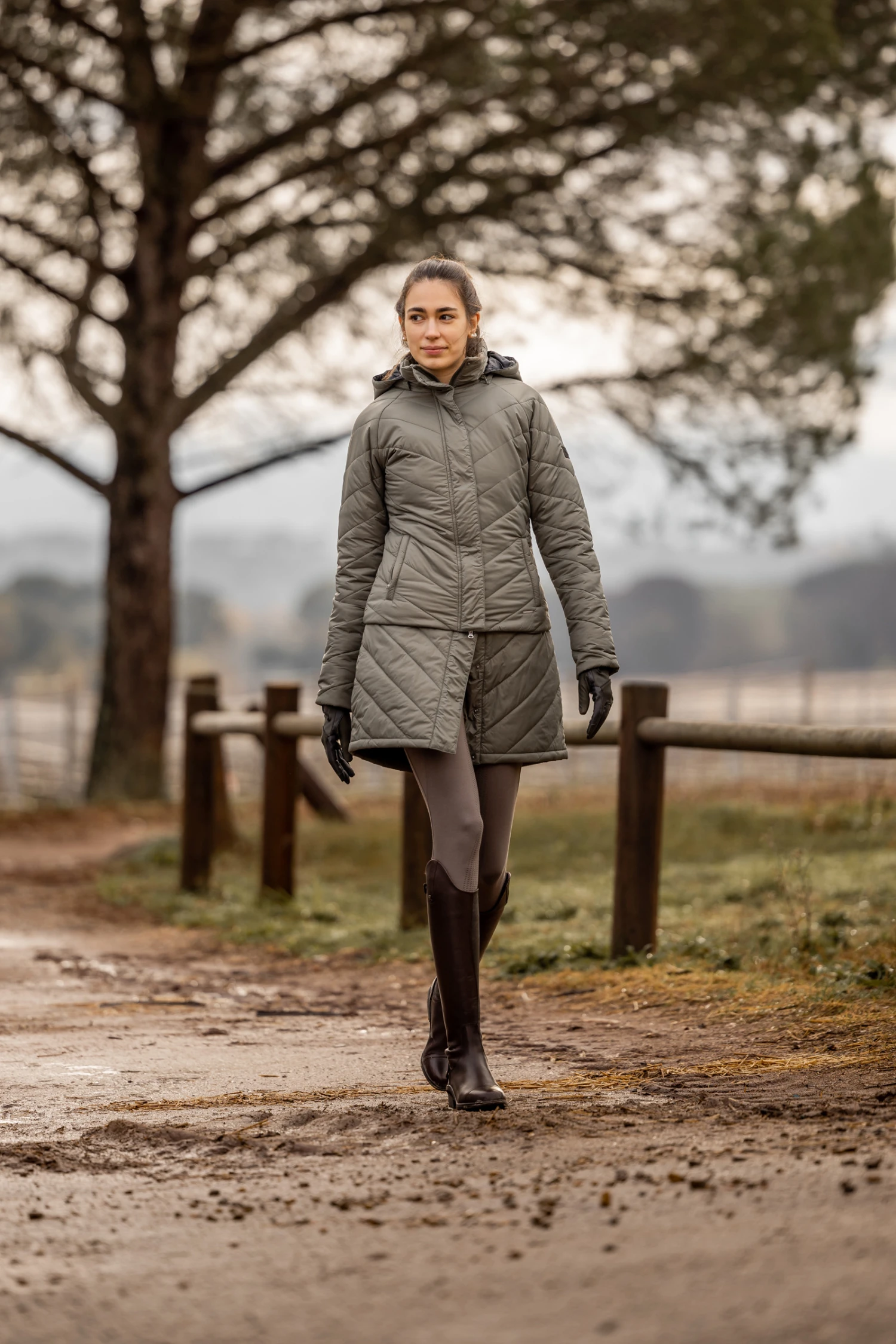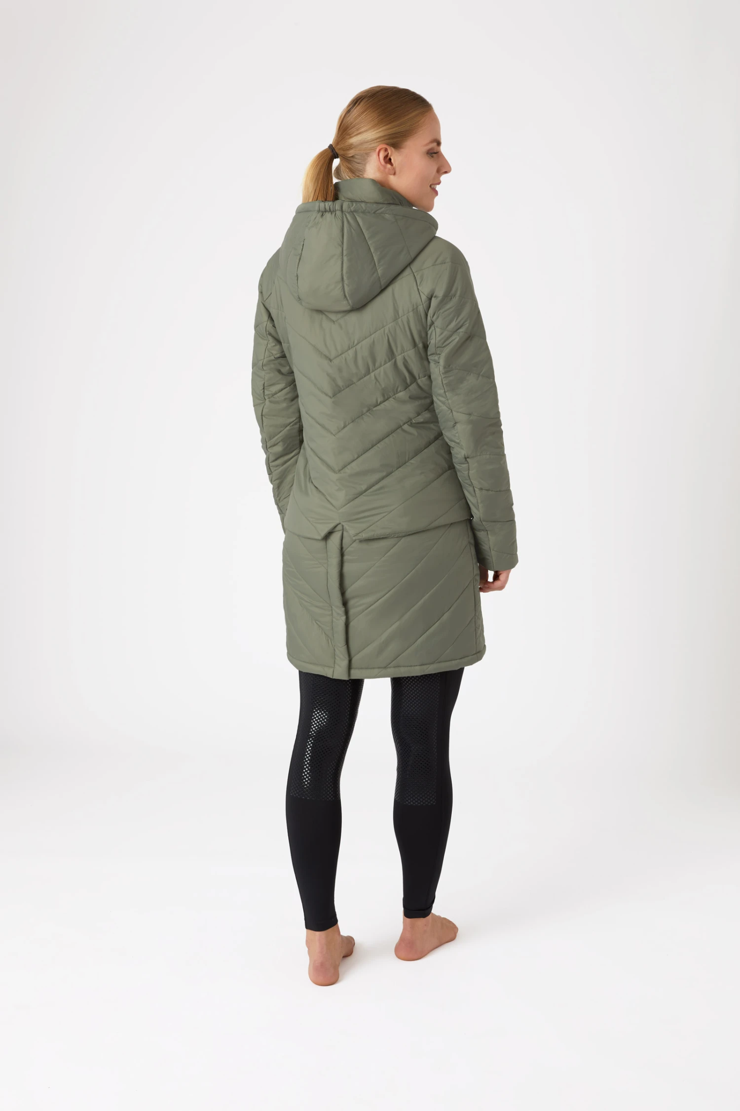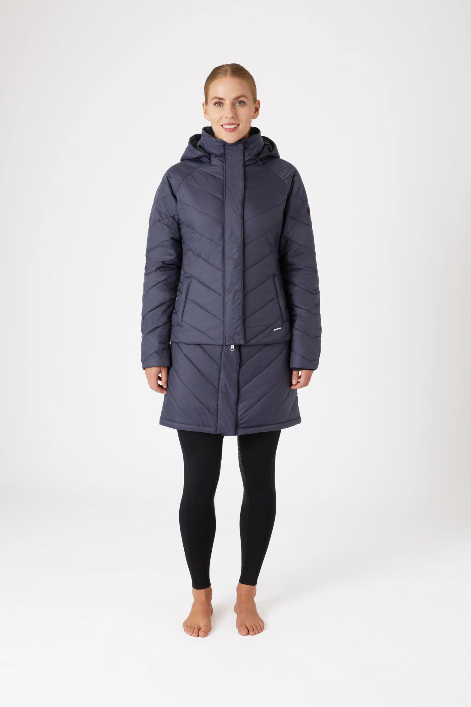 Der Horze Aurora Reitparka besteht aus wasserabweisendem, atmungsaktivem Material, das dich trocken hält und bequem ist. Die Wattierung ist warm, und der lange Schnitt mit Schlitz auf der Rückseite schützt deine Beine beim Reiten. Der hohe Kragen mit Kapuze hält zusätzlich warm. Schmeichelhafte Nähte und Steppung sorgen für eine schöne Form. Die Raglanärmel geben Flexibilität. Zwei Reißverschlusstaschen sind praktisch für deine Habseligkeiten.