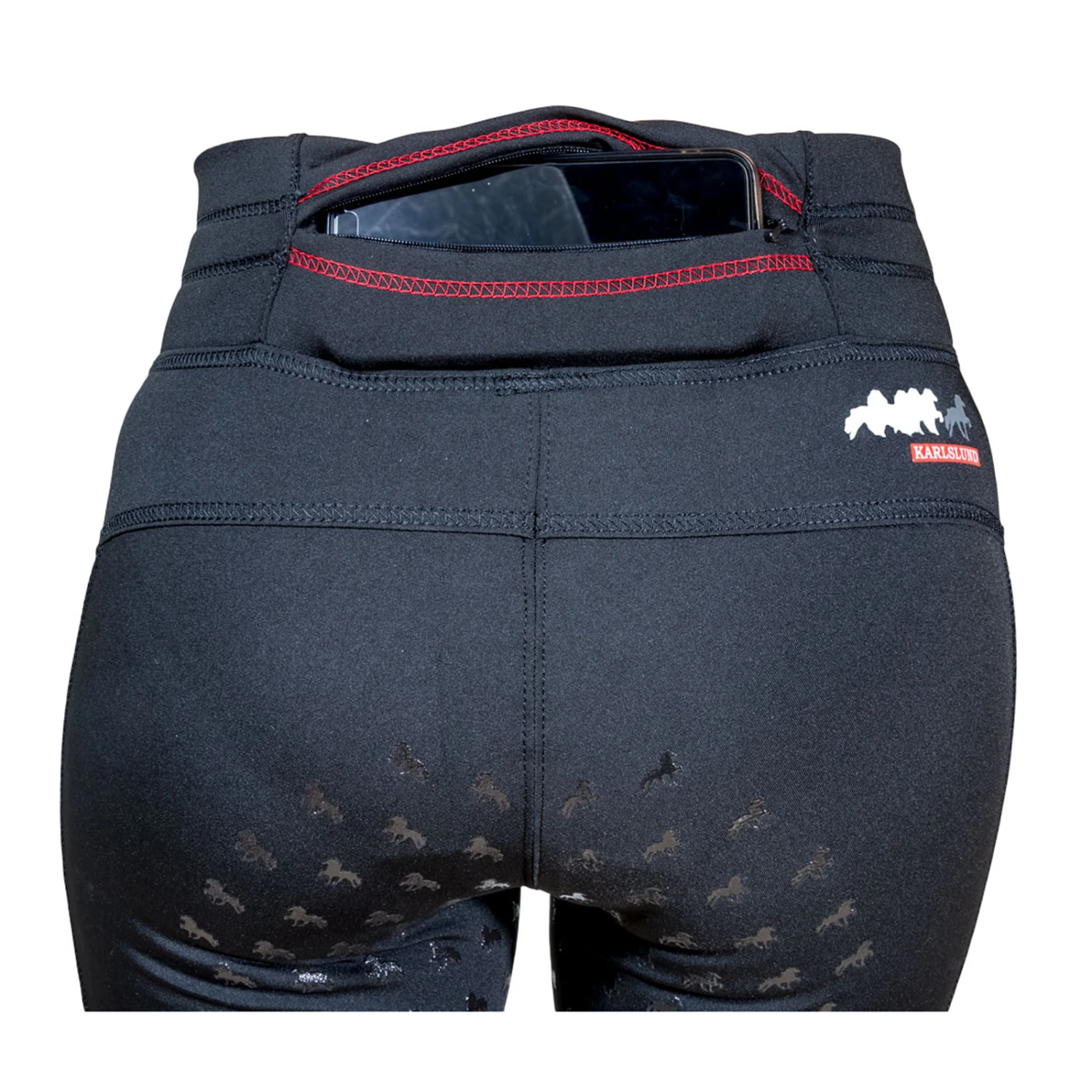 Reithose aus sehr elastischem Material, welches eine hervorragende Passform sowie einen ergonomischen Kompressionseffekt für eine verbesserte Durchblutung der Beine bietet. Aufgrund der Schweißtransport-Eigenschaften und einem leichtem, dünnen Material ist diese Reithose ideal für heiße Tage. Klassisches „Jodhpur“ -Design für die Außenseite der Stiefel. Sehr elegantes Design ohne Nähte auf der Innenseite der Beine und einem durchgehenden Silikonbesatz in Form von töltenden Islandpferden, welcher dem Reiter einen guten Halt im Sattel gibt. Integrierte Taschen auf der Vor- und Rückseite der Hose für ein Handy oder ähnliches. Das Material trocknet äußerst schnell.