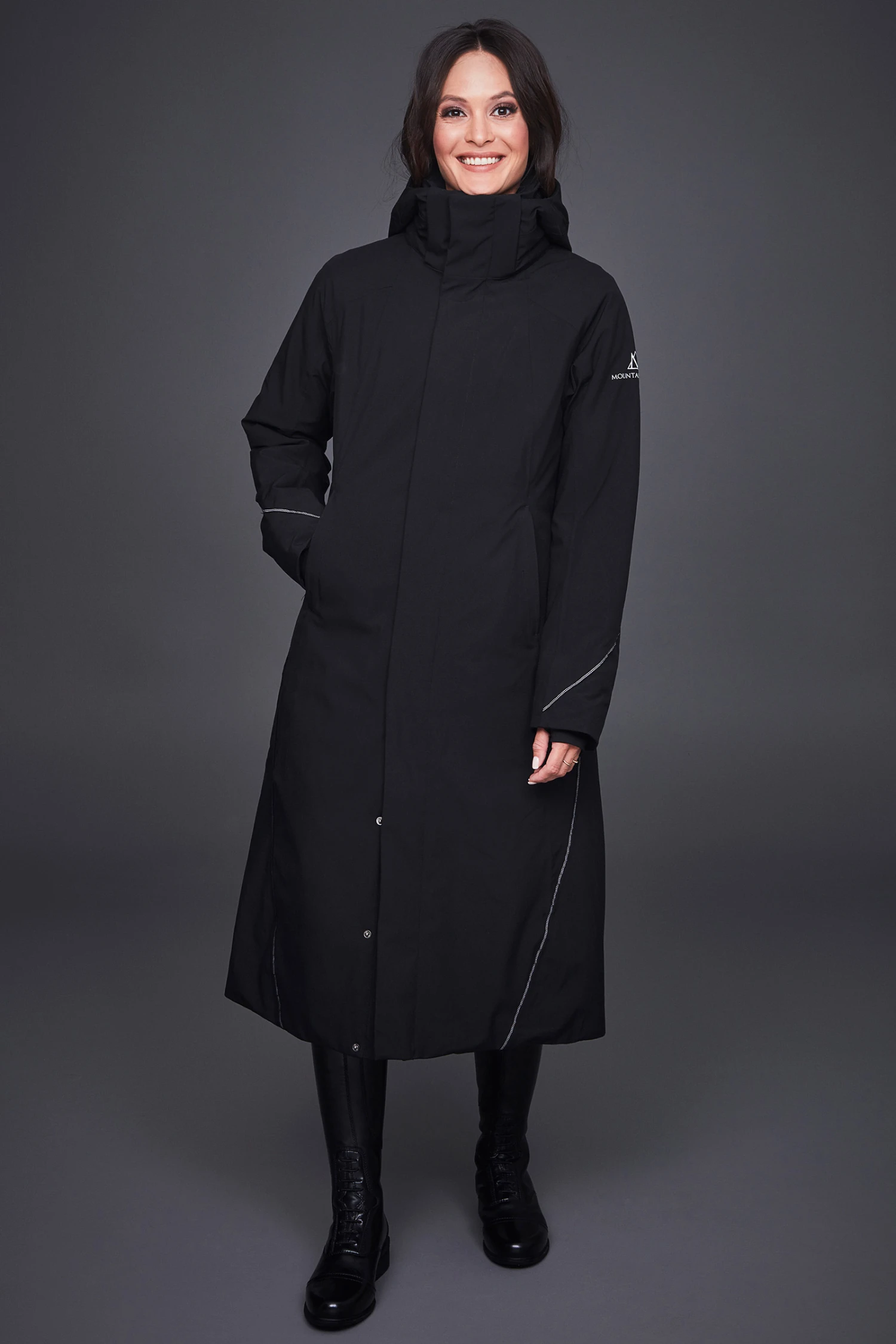 Alicia ist ein leichter, wattierter Mantel mit abnehmbarer Kapuze. Der feminine Schnitt passt sich gut der Figur an, zudem ist er wasser- und winddicht. An den Ärmeln, Rücken und Vorderseite befinden sich reflektierende Details. So bist du auch im Dunkeln gut sichtbar. Mit dem 2-Wege-Reißverschluss und langen Reitschlitz am Rücken der mit Druckknöpfen geöffnet und geschlossen werden kann ist der Mantel bestens zum Reiten geeignet. Zum Verstauen von Leckerlies und Handy gibt es mit Reißverschluss verschließbare Fronttaschen oder eine Innentasche aus Netzgewebe.