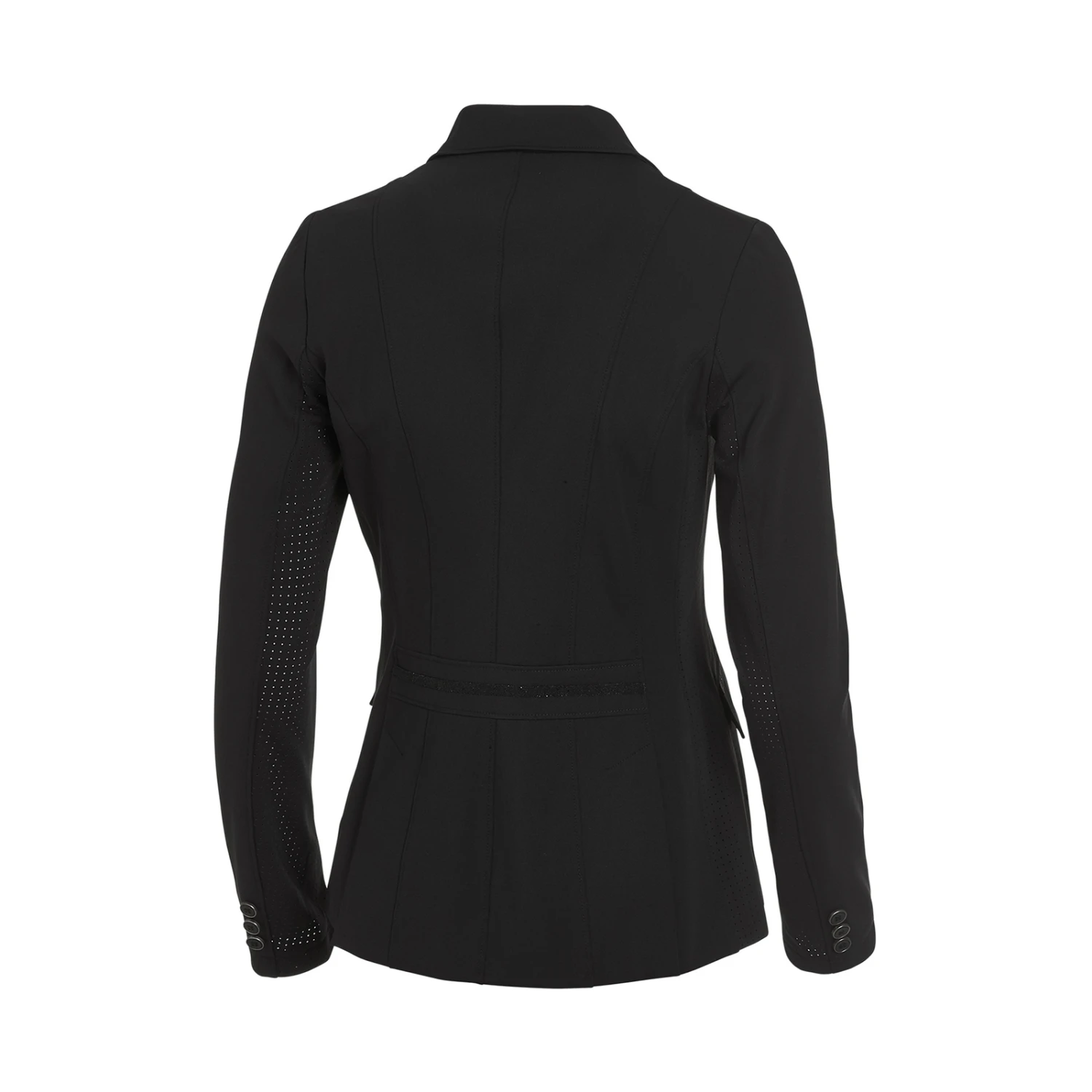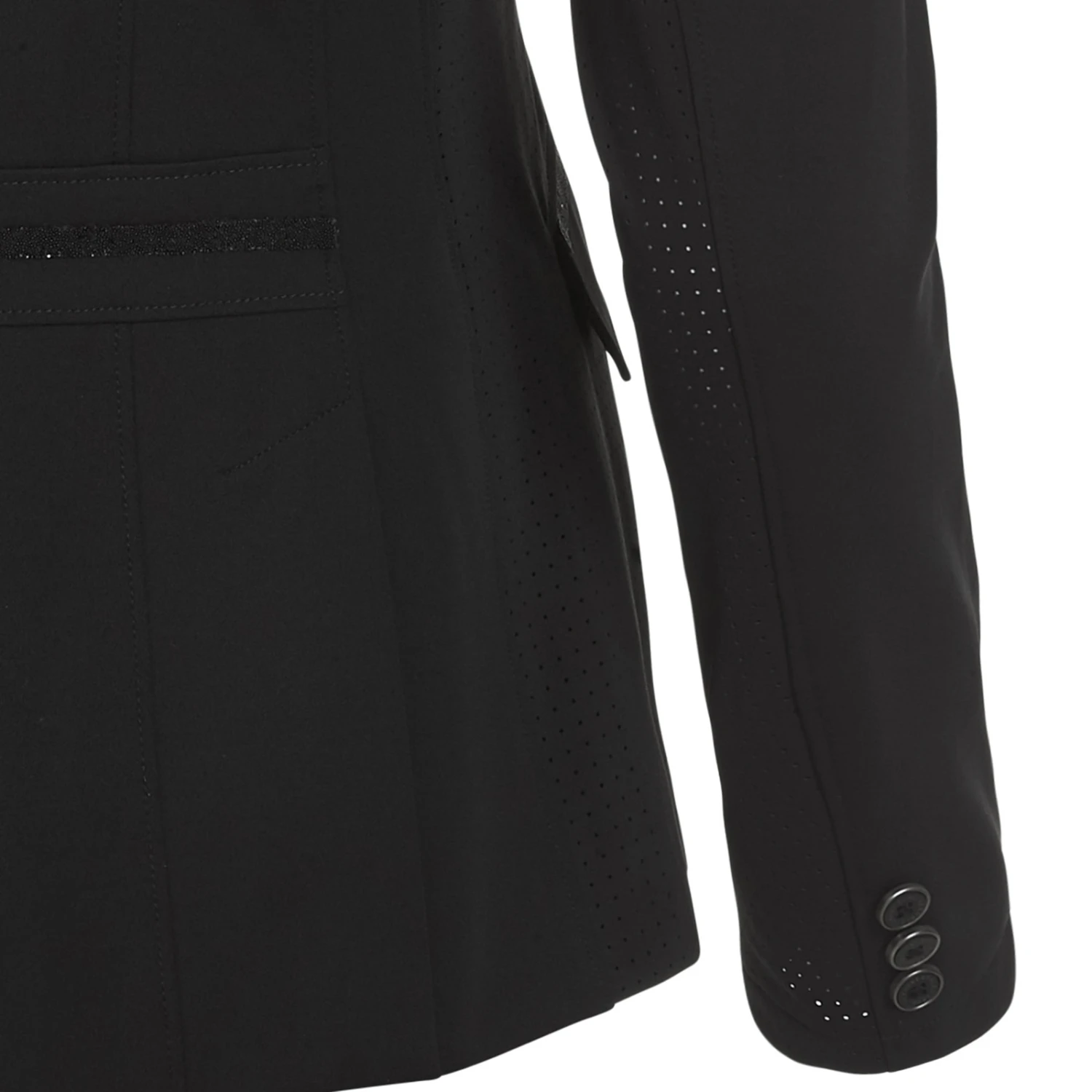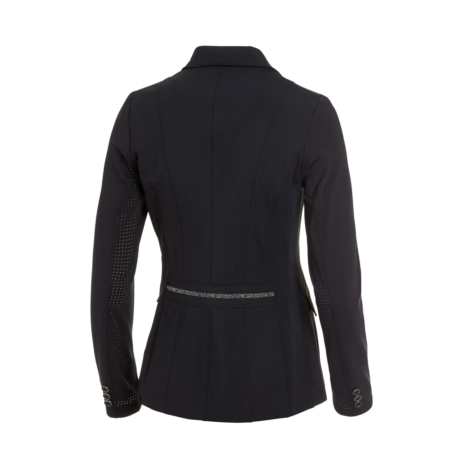 Mit dem figurbetonten Schnitt, den schmeichelnden Teilungsnähten und den kristallglänzenden Verzierungen an den Taschen und am Rücken sorgt sie für einen sportlich-eleganten Look. Die Schlitze am Rücken in Kombination mit dem Stretch-Stoff sorgen für ausreichend Bewegungsfreiheit. Durch die Perforierungen an den Seiten und unteren Ärmeln ist da Sakko besonders atmungsaktiv. Und solltest du doch in’s Schwitzen geraten, dann tut das schnelltrocknende Material sein übriges. Besonders praktisch: Die Jacke ist absolut knitterfrei und lässt sich dank eines verdeckten Reißverschlusses auch auf dem Pferd ganz schnell an- und ausziehen.